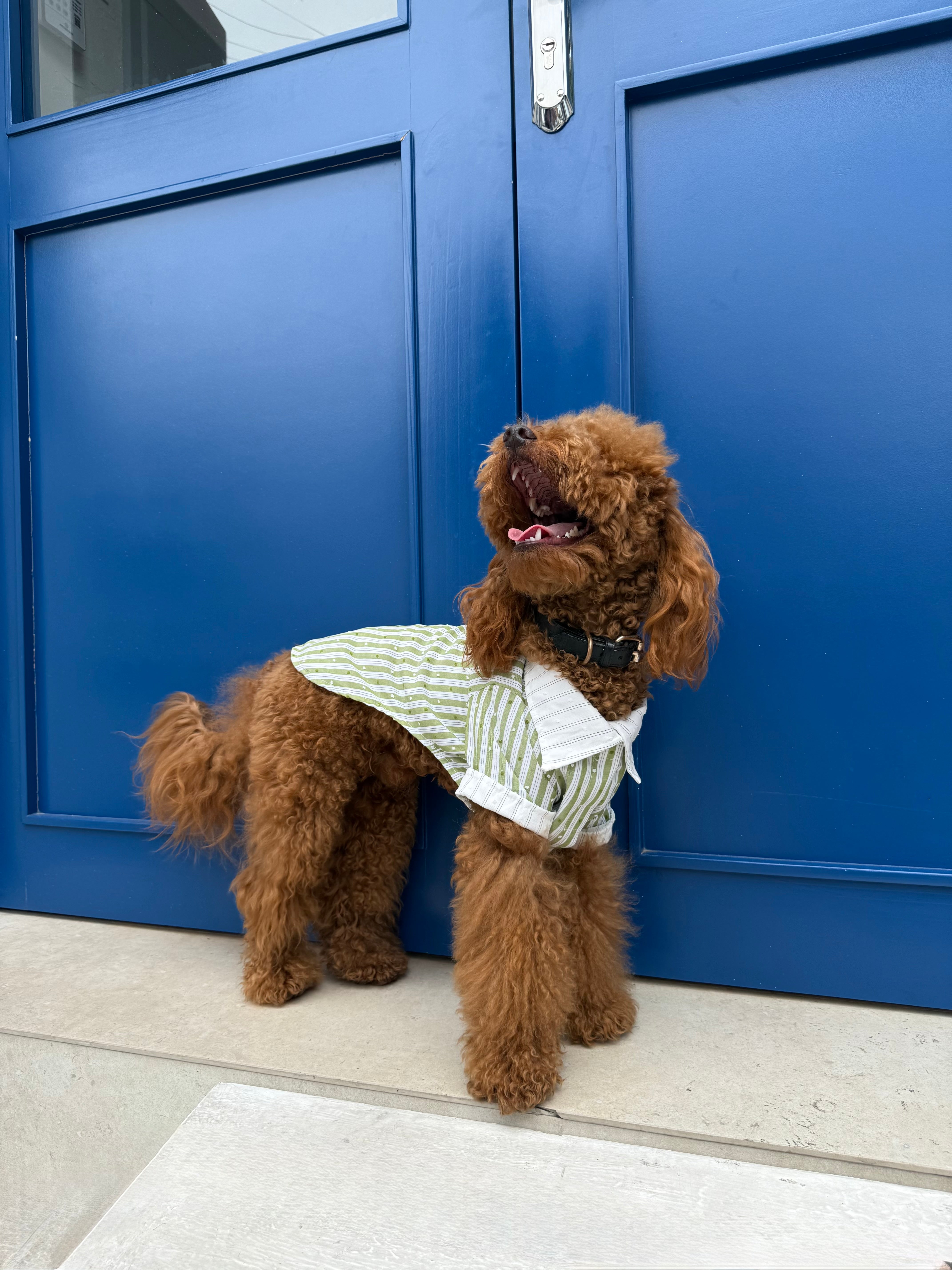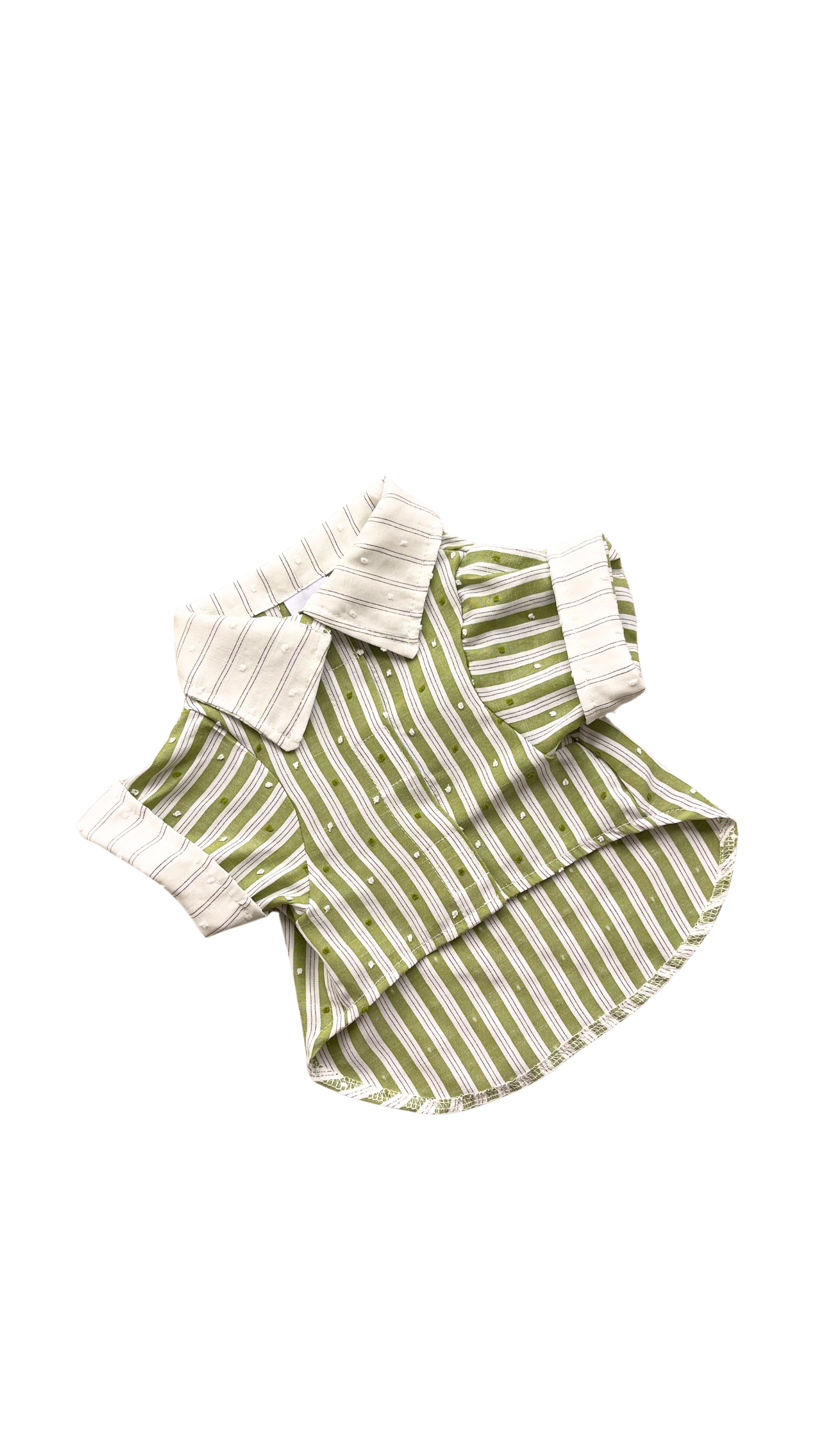 - Diseño inspirado en Grecia: rayas olivo con cuello y puños en contraste color marfil.