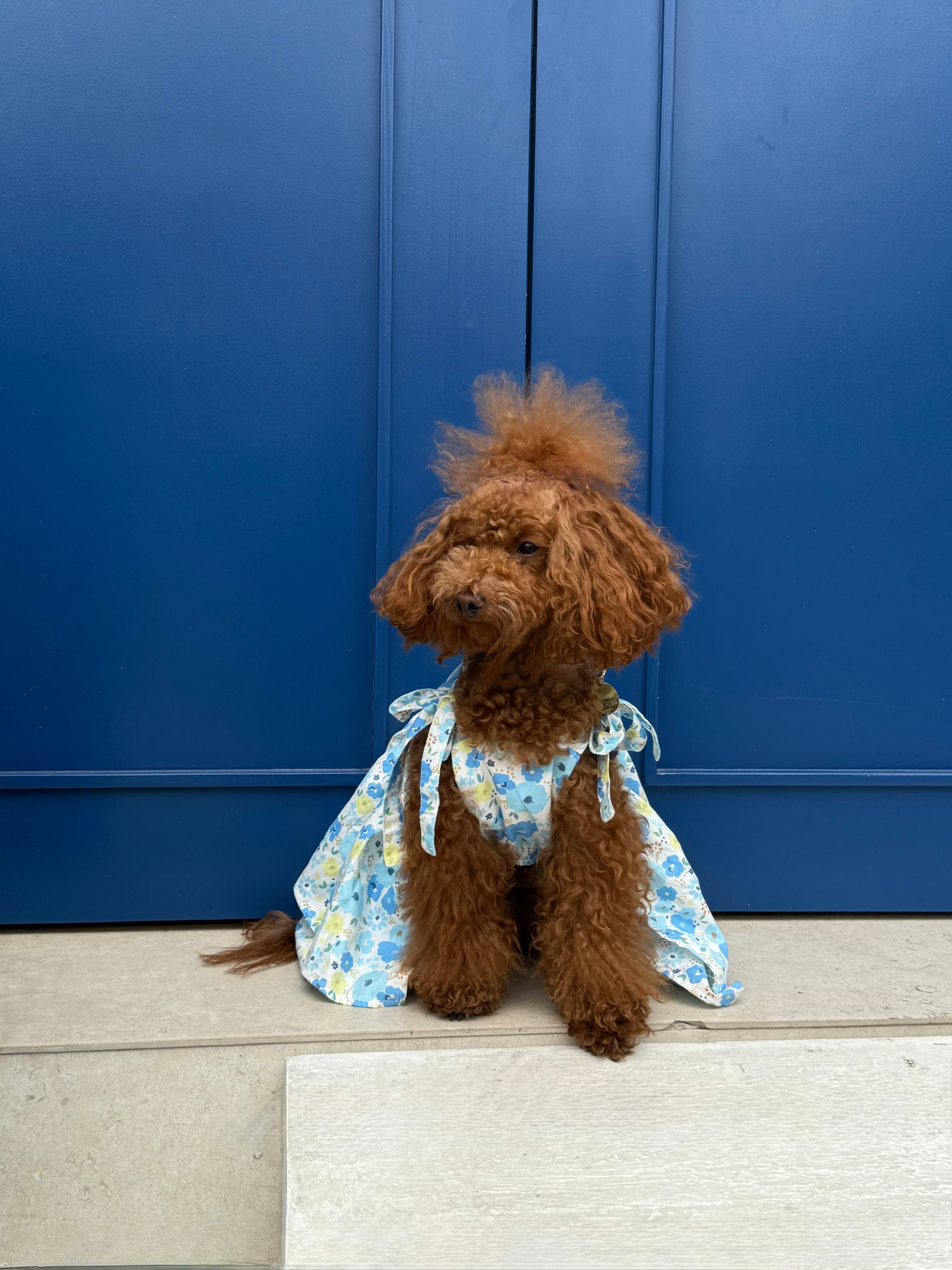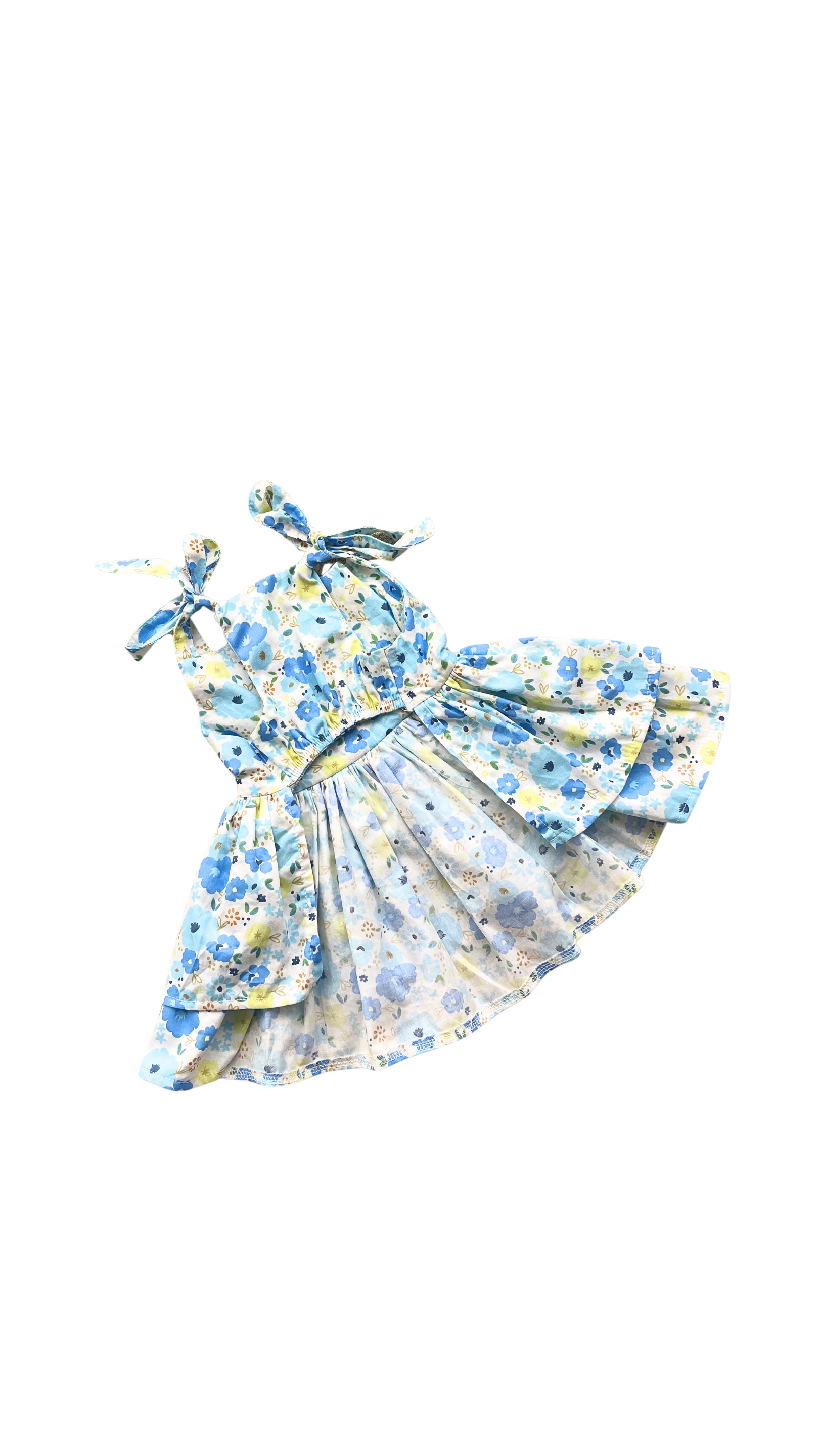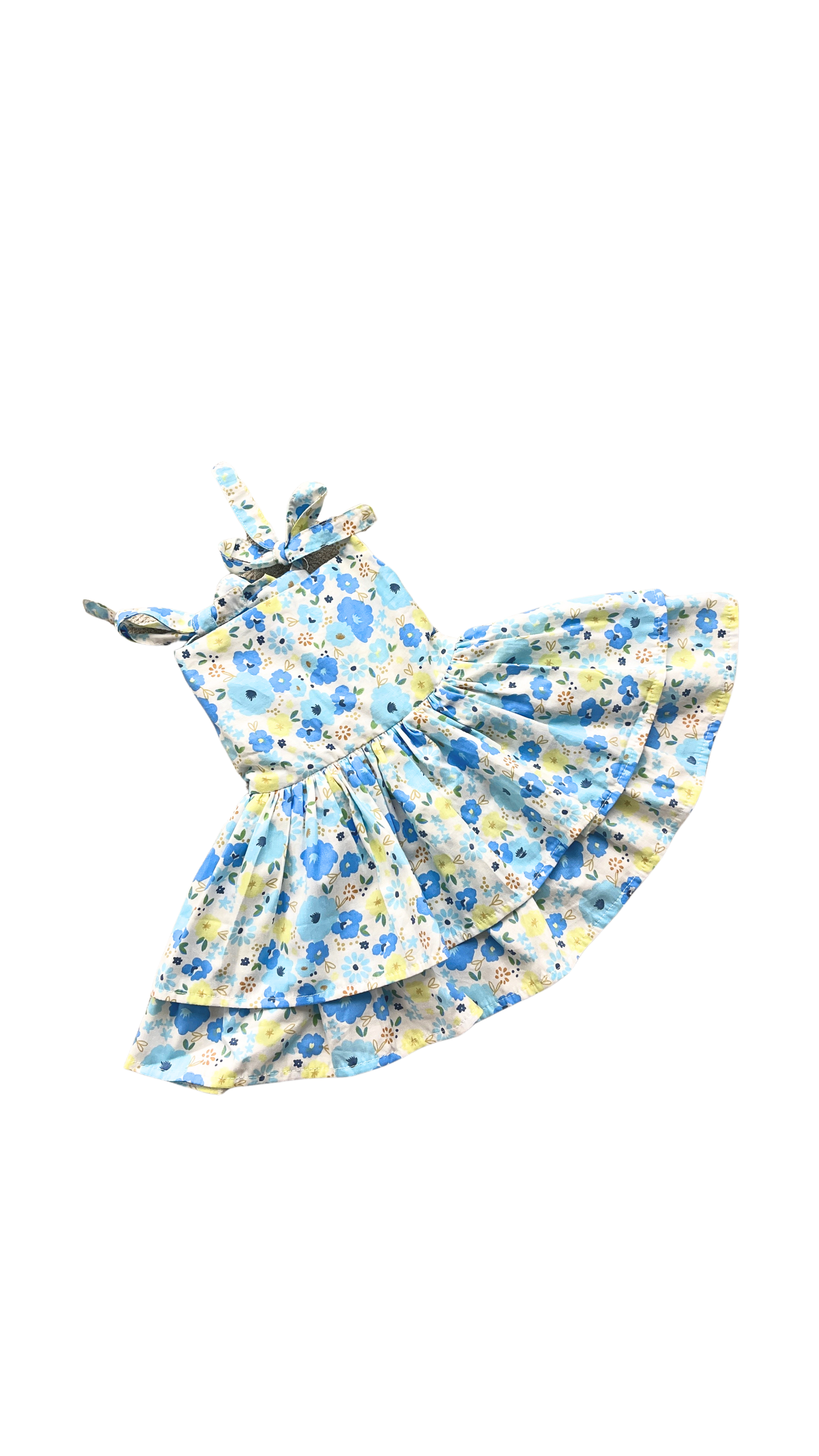 El Vestido Santorini está inspirado en los días soleados frente al mar Egeo, con un estampado floral en tonos azules y amarillos que evocan las fachadas blancas y el cielo profundo de Grecia.