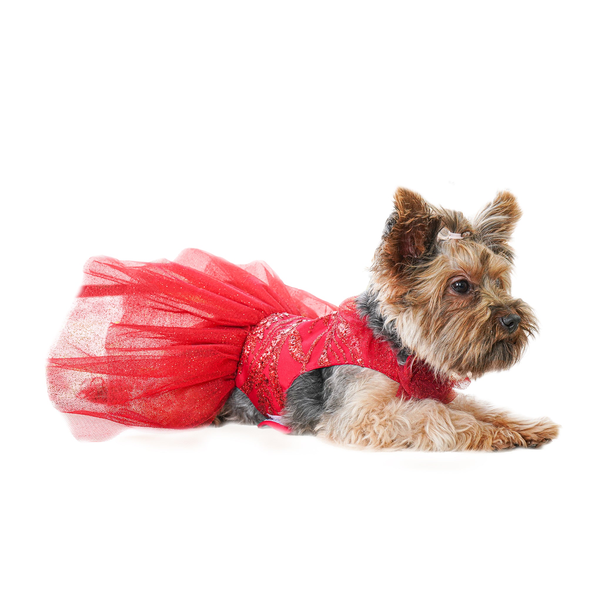 El Vestido Glam Christmas es para perritas que aman robarse el show ✨🎄. Un diseño rojo intenso con cuerpo con brillo tipo glitter y aplicaciones, y una falda de tul con efecto voluminoso que se mueve precioso al caminar. Ideal para la cena navideña, sesión de fotos o cualquier evento donde quieras que tu engreída se vea wow.